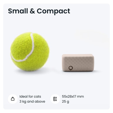 Trackeren er designet for å tåle selv de mest lekne kattene og deres eventyr, og er 100 % vanntett og støtsikker. Den veier bare 25 g, slik at katten din har full bevegelsesfrihet. I tillegg gir batteriet med 48 timers drift deg muligheten til å spore i 2 dager før du må lade igjen.