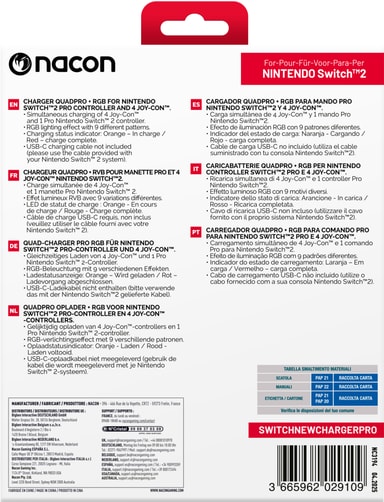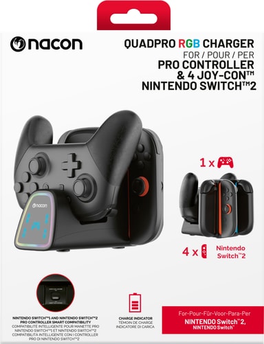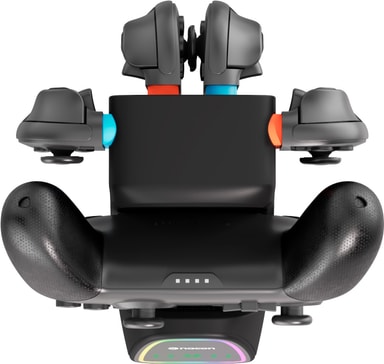 Lad alle JoyCons og en kontroller samtidig med Nacon Switch 2 ladestasjon for kontroller. Den er kompatibel med Switch og Switch 2, har RGB-belysning og en USB-strømtilkobling, slik at du kan lade alle Nintendo-kontrollerne dine samtidig.