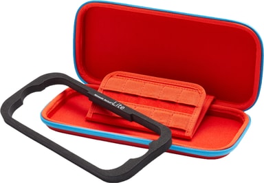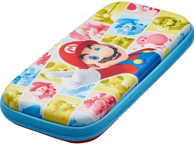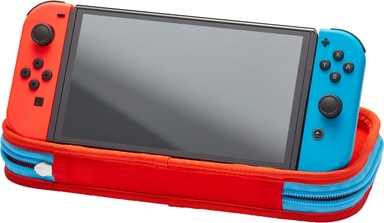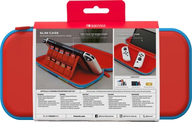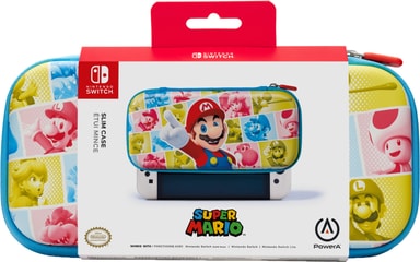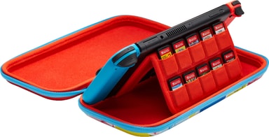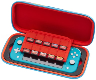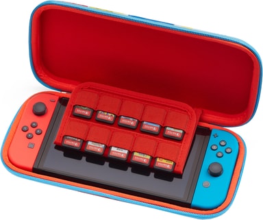 Skaff deg PowerA Nintendo Switch deksel for spillkonsoll til Switch-, Lite- og OLED Nintendo-konsollene dine, og du får et beskyttende etui med Mario-tema med lommer for spill, en innvendig oppbevaringslomme og et integrert stativ.