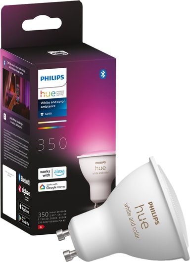 Philips Hue White and Color Ambiance 5,7W GU10 vil få hjemmet ditt i riktig farge og humør. Velg fra 16 millioner farger og kontroller belysningen din komfortabelt via Hue Bluetooth-app eller en Hue-bro.Les mer om produktet