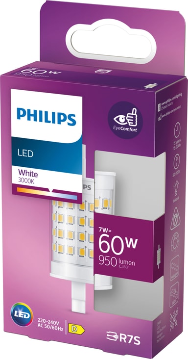 Philips LED pære 7W R7S gir sterkt lys med bare 7 watt strømforbruk. Den lyser med 950 lumen og har et klart, gjennomsiktig design. Perfekt erstatning for halogenlamper.Les mer om produktet