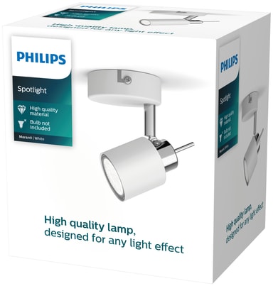 Philips Meranti spotlys har et justerbart spothode som lar deg rette lyset dit du trenger det mest. Den har et elegant hvitt design laget av metall. Det følger ikke med pære, så du kan kombinere den med ditt valg av GU10-pære for å få de lysegenskapene du foretrekker.