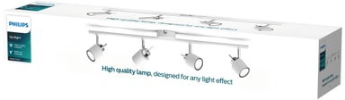 Philips Meranti spotlys har fire justerbare spothoder som lar deg rette lyset dit du trenger det mest. Den har et elegant hvitt design i metall. Det følger ikke med pære, så du kan kombinere den med ditt valg av GU10-pære for å få de lysegenskapene du foretrekker.