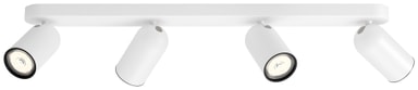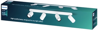 Philips Pongee spotlys har en elegant silhuett og er laget av metall. De er enkle å montere takket være ClickFix-systemet. Du monterer ganske enkelt braketten på taket eller veggen, kobler til ledningene og klikker deretter på armaturen. Denne Pongee-armaturen er hvit og har fire justerbare spothoder. Det følger ikke med lyspære, så du kan fritt velge GU10-pære med dine foretrukne lysegenskaper.