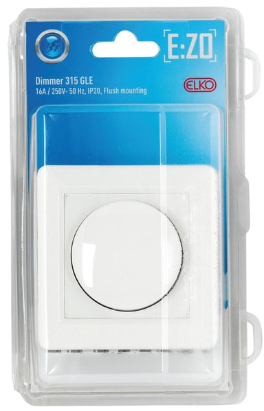 Denne dimmeren fra ELKO kan brukes med glødepærer, 230V halogenpærer eller lavvolt halogen med de fleste typer elektronisk trafo. Dimmeren er utstyrt med trykk-inn bryter, elektronisk sikkerhet, myk start og isolerte koblingsterminlaer. Passer standard veggbokser og alle E:ZOkombinasjonsplater.