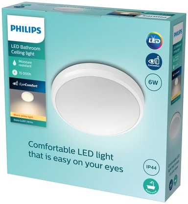 Med Philips Doris taklampe 6W kan du ta baderomsbelysningen til et nytt nivå og skape en avslappende og koselig atmosfære. Takket være det varmhvite lyset og EyeComfort-teknologien, er lampen beroligende for øynene.Les mer om produktet