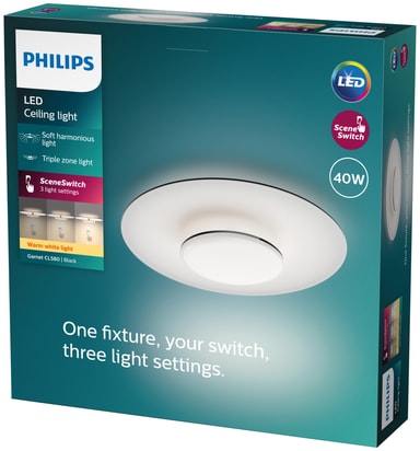 Philips Garnet taklampe 40W med et stilrent moderne design vil friske opp utseende til hjemmet ditt. Et varmhvitt lys og SceneSwitch-teknologi med tre innstillinger skaper en harmonisk atmosfære, så du kan være sikker på at lyset passer perfekt i alle rom.