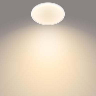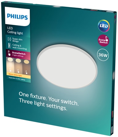 Philips SuperSlim taklampe er en serie med superelegante og slanke armaturer som gir LED-belysning av høy kvalitet til ethvert rom i hjemmet ditt. Takket være den integrerte SceneSwitch-funksjonen kan du nyte varmhvitt lys i tre lysstyrkeinnstillinger: 100%, 50% eller 10%. Dette er ideelt når du ikke allerede har installert en dimmer, siden du enkelt kan endre innstillingen med den eksisterende bryteren din. Den innebygde minnebrikken husker den siste innstillingen du brukte. Dette armaturen måler 55 cm i diameter og har hvit finish.