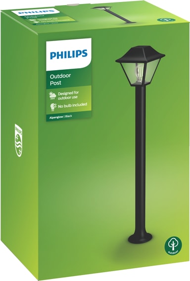 Philips Alpenglow stolpelampe 60W E27 fremhever inngangspartiet, hagen eller uteplassen og skaper en hyggelig atmosfære. Denne lykten av høy kvalitet med IP44-sertifisering er værbestandig og vil tjene deg i mange år fremover.Les mer om produktet