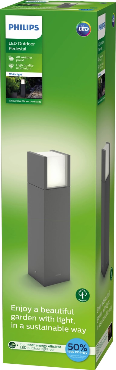 Lys opp oppkjørselen, hagen og stiene på eiendommen din med letthet takket være elegante Philips Arbor utendørs sokkellampe 3,8W. Denne ultraeffektive utelampen gir deg en langvarig belysningsløsning samtidig som den reduserer energikostnadene. Lyset produserer varmt fargetemperaturlys på 3000k og tilbyr enkel installasjon. I tillegg kommer lyset med IP44-værbestandig design.