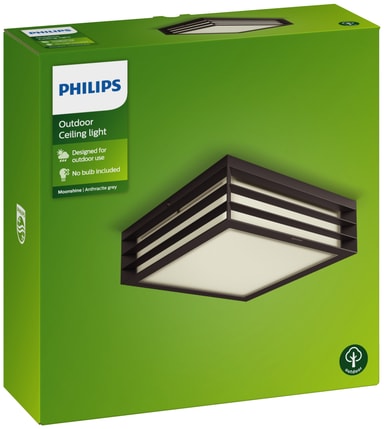 Philips Moonshine utendørs taklampe E27 vil enkelt lyse opp hagen, terrassen eller verandaen. Denne elegante lampen passer for opptil to 14W-lyspærer med E27-sokkel, og gir deg rikelig med lys over et stort område. Den har IP44-værbestandig design.Les mer om produktet