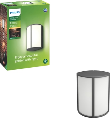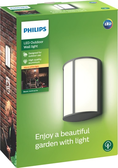 Lys opp hagen, verandaen eller ytterveggen med Philips Stock Outdoor vegglampe 5,5W. Den veggmonterte lampen har et elegant design som fremhever hagens estetikk. Lampen på 5,5 watt har en IP44-klassifisert, værbestandig konstruksjon som tåler regn og snø.