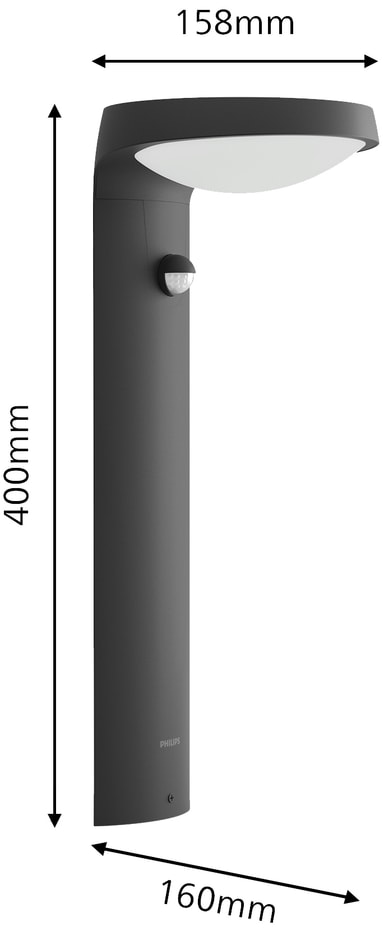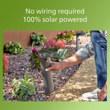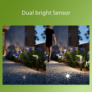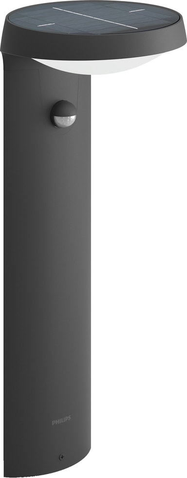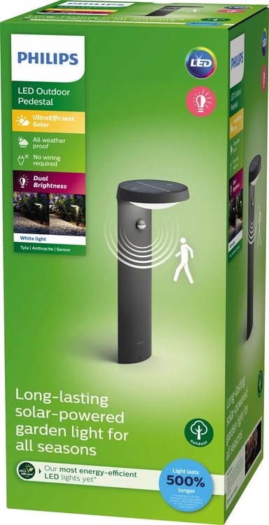 Hold uteplassen, verandaen eller hagen belyst om natten med Philips Tyla IR sokkellampe med solceller 1,2W. Det ultraeffektive, solcelledrevne lyset krever ingen ledninger, og gir deg en allsidig belysningsløsning og enkel installasjon. Lyset har en infrarød bevegelsessensor, som automatisk slår lyset på når bevegelse oppdages. Dessuten vil det værbestandige IP44-designet lett takleregn og vind.