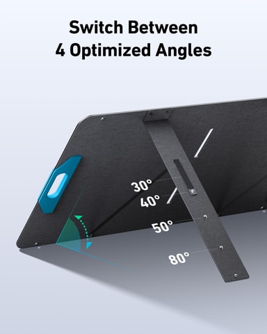 Dette bærbare solcellepanelet er designet for å være fleksibelt plassert i 30°, 40°, 50° eller 80° vinkler, noe som gjør at det kan fange sollys når som helst på dagen og når som helst på året, og gjør det svært anvendelig i bruk.