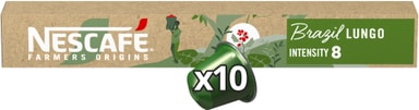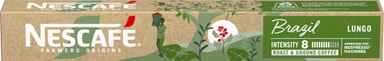 Nescafé Brazil kaffekapsler 12536743 gir deg ti kopper med Lungo-kaffe i brennegrad6 som du kan nyte hjemme. De resirkulerte aluminiumkapslene bevarer den balanserte, men ristede kaffesmaken når du ønsker en god kopp.