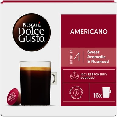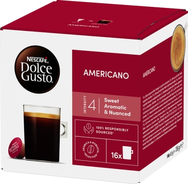 Forvandle morgenene dine med NESCAFÉ Dolce Gusto Americano Coffee, en 100 % Arabica-kaffe med en intensitet på 4 av 11. Denne lange koppen med smakfull Americano-blanding er en elegant kaffe med fruktige og blomsterlignende toner, og en fin crema. Nyt de nyanserte tonene av litchi og rose, i denne lettbrente kaffen på krusstørrelse. Americano er laget for kaffeelskere som vil ha den rike smaken til en flott svart kaffekapsel i en lengre, jevnere kopp, og er et ikonisk brygg for de fineste kaffebarene. Om du leter etter en fantastisk smakfull americano-blanding som ikke er for dristig, prøv våre Americano-kaffekapsler!. Ingredienser: Kaffe (100%).