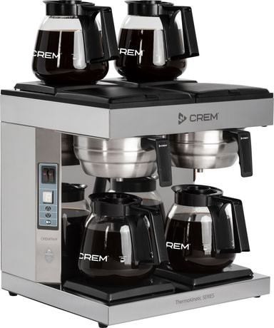 Crem ThermoKinetic DA4-4 kaffetrakter er en maskin designet for travle og lange dager på kontoret. Den har automatisk vannpåfylling, to bryggeplasser og to varmeplater på toppen, for å holde mer kaffe varm. Den er utstyrt med et digitalt display og en alarm som varsler når bryggingen er ferdig. Brygg kaffe direkte gjennom lokket til begge 1,8 liters glasskaraflene, som fører til enkel håndtering og servering.