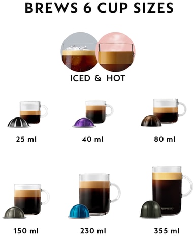 Kapselmaskinen støtter 6 koppstørrelser: Ristretto, Espresso, Double Espresso, Gran Lungo, Mug, Alto, og kalde drikker. Maskinen justerer automatisk bryggeinnstillingene for å gi deg den perfekte drikken hver gang.