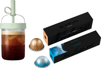 Utforsk et utvalg av drikker med et rør med 10 kapsler av Ice Leggero kaffeblandingen, og et annet rør med 10 kapsler av Melozio.