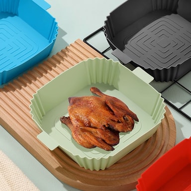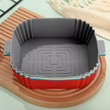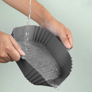 Gryten er laget av matgodkjent silikon og kan gjenbrukes og vaskes, noe som gjør det lettere å unngå klebrige og brente rester. Det følger også med 2 mini grytehansker i silikon for å beskytte hendene når du tar ut varme gjenstander fra for eksempel airfryer eller ovn.