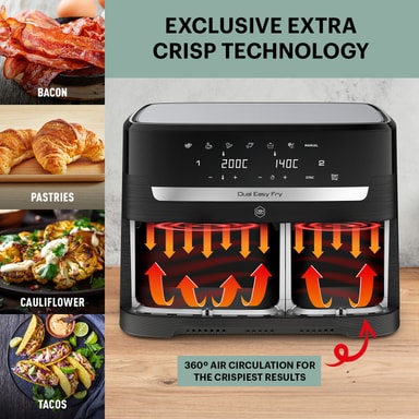 OBH Nordica XXL Dual Easy Fry airfryer AG9428S0 på 2700 W har en kapasitet på 11 liter, to kurver, åtte innstillinger og syv programmer. Det digitale displayet lar deg styre hver kurv uavhengig av hverandre for effektiv tilberedning.Les mer om produktet
