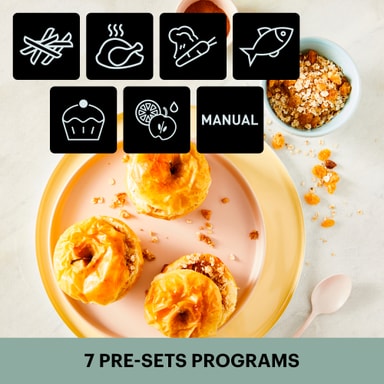 Velg mellom sju forhåndsinnstilte programmer som passer til din rett. Du kan steke, bake og steke grønnsaker, kjøtt eller tilberede store mengder nuggets, pommes frites og fisk.