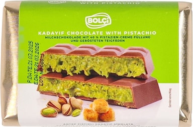 Bolci Dubai-sjokolade KLIPP8771 er en fyldig, smakfull forening av myk melkesjokolade, fløyelsmyk pistasjkrem, og sprø kadayif-biter - som gir en smak av Midtøsten i hver bit. Et perfekt valg for en godbit til deg selv, eller en gave.