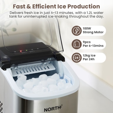 En ismaskin med 1,2 liters kapasitet produserer fersk is på bare 6 til 13 minutter. Perfekt for rask is på bestilling, som sikrer at du alltid har en jevn forsyning av is når du trenger det.