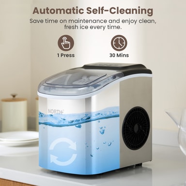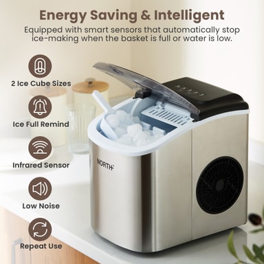 North iskubemaskin 205204 (sølv) leverer fersk is på 6-13 minutter med en kapasitet på 1,2 liter. Den har et innebygd selvrensende program, automatiske sensorer og et dreneringsutløp, som sikrer enkelt vedlikehold og hygiene. Kompakt, trygg og effektiv.