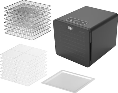 Raw dehydrator DH8 lar deg tilberede sunn snacks til familien din. Med åtte brett og en tørkeoverflate på 0,7m2, gir den mer enn nok plass til tilberedning avstørre matmengder. Med timer-funksjon og et justerbar temperaturspenn, som gjør den praktisk for tørking av frukt, urter, nøtter, og sopp hjemmefra.