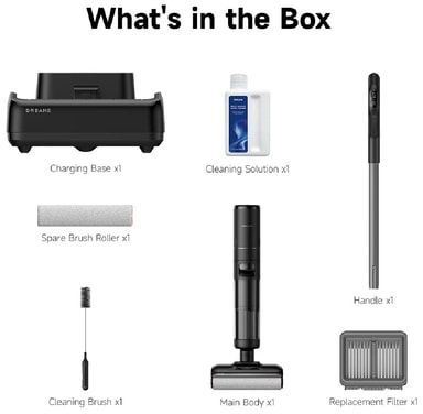 Den håndholdte støvsugeren leveres med ladestasjon, håndtak, hoveddel, ekstra børsterull, reservefilter, rengjøringsbørste og rengjøringsmiddel for komplett løsning.