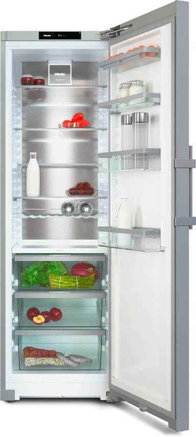 Miele kjøleskap KS4885DDedt/csNEU2 holder maten din fersk takket være fantastiske funksjoner som PerfectFresh Pro, en funksjon som automatisk justerer temperaturen for å oppnå maksimal ferskhet til enhver tid. FlexiLight 2.0 lar deg justere lysene i apparatet individuelt, mens DynaCool sørger for at temperaturen holder seg jevn kontinuerlig.