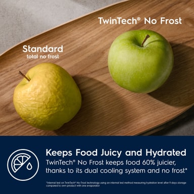 TwinTech NoFrost intelligent dobbelt kjølesystem holder på fuktigheten i matvarene og motvirker tørrhet. Kjølesystemet er overlegent standard NoFrost og kjøler kjøleskapet og fryseren uavhengig av hverandre. I fryseren vil det ikke dannes rim, og kjøleskapet opprettholder optimalt fuktighetsnivå, noe som gir 60 % mindre mattap.