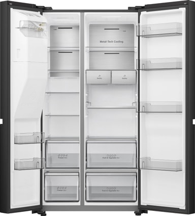 Med en totalkapasitet på 632 liter har dette side-by-side kjøleskapet god plass til alle dagligvarene dine. Kjøledelen på 417 liter og fryseren på 200 liter gir rikelig med plass til ferske matvarer, drikke og frosne nødvendigheter. Den elegante sorte overflaten gir et stilig og sofistikert preg til ethvert kjøkken.