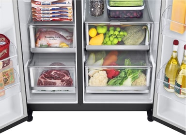 LG side by side kombiskap GSGV80EPLD gjør matoppbevaring enkelt og effektivt med isdispenser og Knock-on-dørteknologi, noe som gjør den til det perfekte apparatet for å holde maten fersk lenger og unngå matsvinn.Les mer om produktet