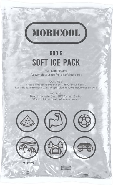 Med Mobicool mykt kjøleelement trenger du ikke bekymre deg for at dypfrossen mat smelter bort. Sett denne 600 g ispakken i en kjølebag, så holder du dagligvarene frosne i flere timer. Pakken er ideell for frossen og fersk mat, og takket være dens fleksibilitet sørger den for nærmere kontakt med produktene i bagen, noe som gir en mer pålitelig kjøleeffekt. I tillegg kan den brukes som en varm pute når den er oppvarmet.
