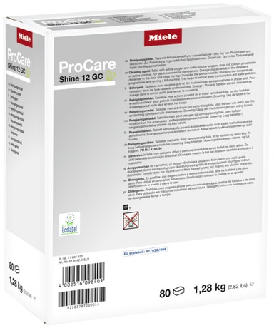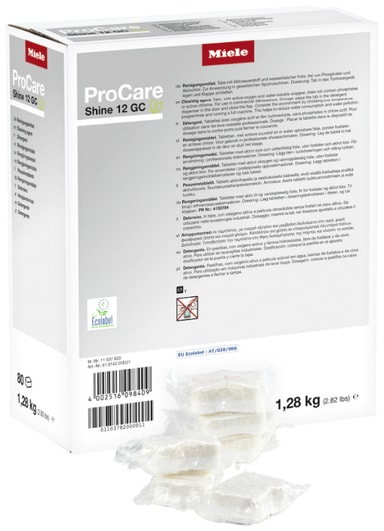 Miele ProCareShine vaskemiddeltabletter passer fint til hoteller, puber og kaféer. De kommer uten fosfater og klor, og har en praktisk vannoppløselig innpakning. De 80 aktive oksygentablettene egner seg til alle Profi- og MasterLine-oppvaskmaskiner.Les mer om produktet