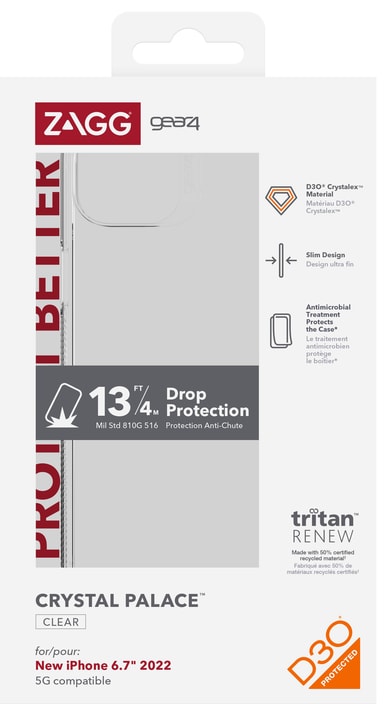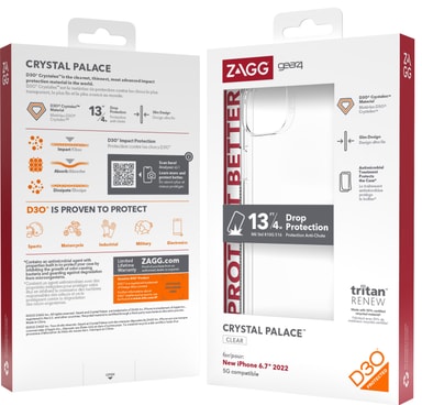 Sterke og slitesterke Gear4 Crystal Palace iPhone 14 Plus deksel gir telefonen din den ultimate beskyttelse. Dekselet er laget av solide materialer for maksimal beskyttelse, og kan tåle fall fra opptil 4 meter. Det gjennomsiktige dekselet har et antimikrobielt belegg og antigulningsmiddel for et elegant utseende.. Takket være en slank profil er dekselet kompatibelt med trådløs lading.