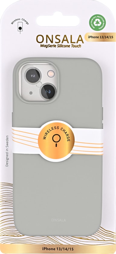 Onsala iPhone13/14/15 silikondeksel er et stilig, men praktisk tilbehør som beskytter smarttelefonen din mot støt og riper. Dekselet sitter tett på din iPhone, og gir beskyttelse og enkel tilgang til sideknapper, porter og høyttalere uten å gjøre telefonen mye større. Resirkulert silikon gir en myk finish som ligger godt i hånden. Dekselet er også kompatibelt med MagSafe-lading.