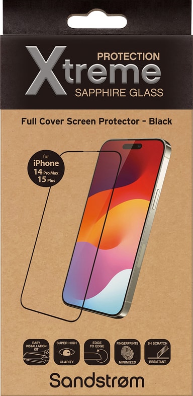 • Sandstrøm iPhone 14 Pro Max/15 Plus/16 Plus Curved Glass beskytter