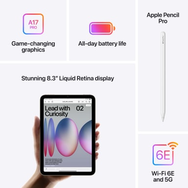 Fem iPad mini-modeller holdes i vifteform. Hovedkameraet vises på én av modellene, mens de andre fire vises forfra. Apple Pencil Pro brukes til å ta notater