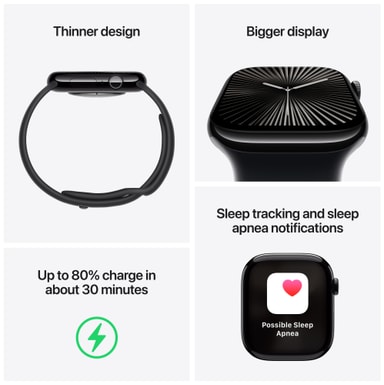 Bli kjent med Apple Watch Series 10. Større skjerm med større skjermområde og en tynnere og lettere design. Få avanserte trenings- og helsefunksjoner, blant annet varslinger om søvnapné,1 samt raskere lading.