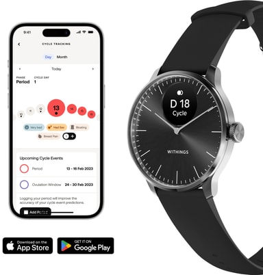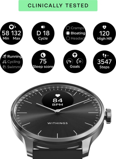 ScanWatch Light har mange funksjoner for helsesporing takket være de innebygde sensorene. Når du føler deg syk, kan du logge symptomer og spore trender. Den registrerer kontinuerlig pulsvariabilitet og sender et varsel når den oppdager uregelmessig hjerterytme. Klokken tilbyr dessuten helseovervåking for kvinner. Resultatene kan vises på enhetens display og i smartappen. Her finner du enda mer inngående data og statistikk.