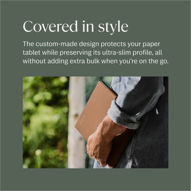 reMarkable BookFolio Pro har som mål å holde reMarkable Pro-enheten din trygg og stilig. Det førsteklasses skinndekselet fremhever stilen din og festes magnetisk til enheten, samtidig som det er plass på siden til reMarkable Marker. reMarkable Book Folio har intelligente funksjoner og førsteklasses materialer, og sørger for at det digitale papirbrettet ditt beskyttes med stil, samtidig som det forbedrer arbeidsflyten din.