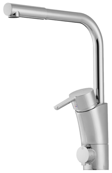 Elegant blandebatteri til kjøkken i krom, med stoppekran for oppvaskmaskin og innebygd energisparingssystem, ESS. Blandebatteriet har dreibar tut som kan begrenses ved 60, 85, 110 eller 360 grader, samt myktstengende håndtak med keramisk pakning.