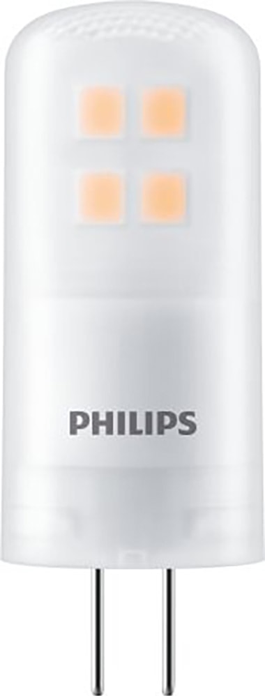 Philips Capsule LED-pære 1,7W G4 gir varmhvitt 210 lumen lys ved kun 2,1W. Den passer til G4-sokler og er perfekt for mindre innredningsmomenter og dekorativ belysning.Les mer om produktet