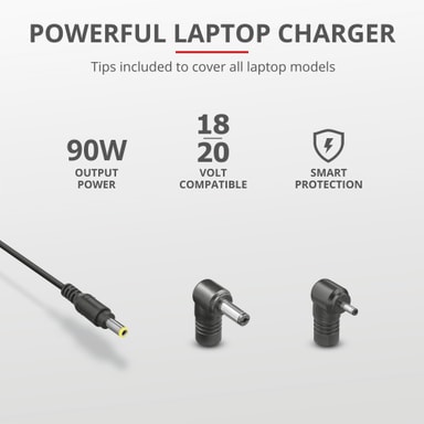 Trust Maxo Acer 90W lader til bærbar PC med 3 m kaber kan lade opp din Acer Aspire/Swift/Spin/Travelmate/Extensa raskt og trygt med Trust Smart Protection System for å forhindre overbelastninger, overlading, overopphetning og kortslutninger. Takket være tre forskjellige tilkoblinger er det også mulig å lade opp andre bærbare PC-er.