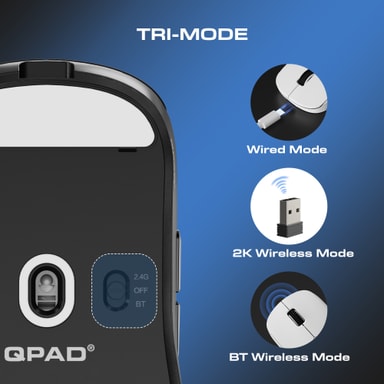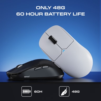 QPAD Mark Model 1 trådløs mus har et 48 g lett design med en justerbar DPI på opptil 26 000 DPI, en PAW 3395-sensor, dual-mode-tilkobling, en pollingfrekvens på 2000 Hz og 60 timers batteritid for uavbrutt gaming og arbeid.Les mer om produktet