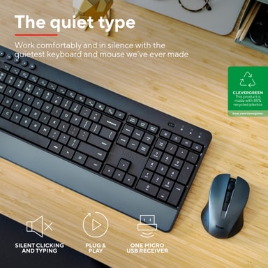 Takket være Trust TKM-450 trådløst tastatur og musesett, vil arbeidsplassen din bli et symbol på ro og produktivitet. Du kan forberede deg på et nesten stressfritt arbeidsmiljø på grunn av produktets tre kjernefunksjoner – stillhet, sølemotstand og komfortabel design. Til slutt er settet laget med 85 % resirkulerte materialer, noe som betyr at kjøpet ditt også bidrar til å bygge en bærekraftig fremtid for ikke bare din bedrift, men også for planeten.