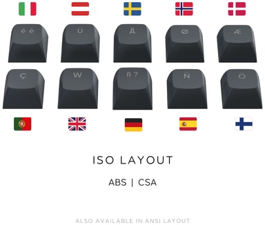 - Støtter flere språk med ekstra tastehettesett; ANSI- og ISO-varianter tilgjengelig.